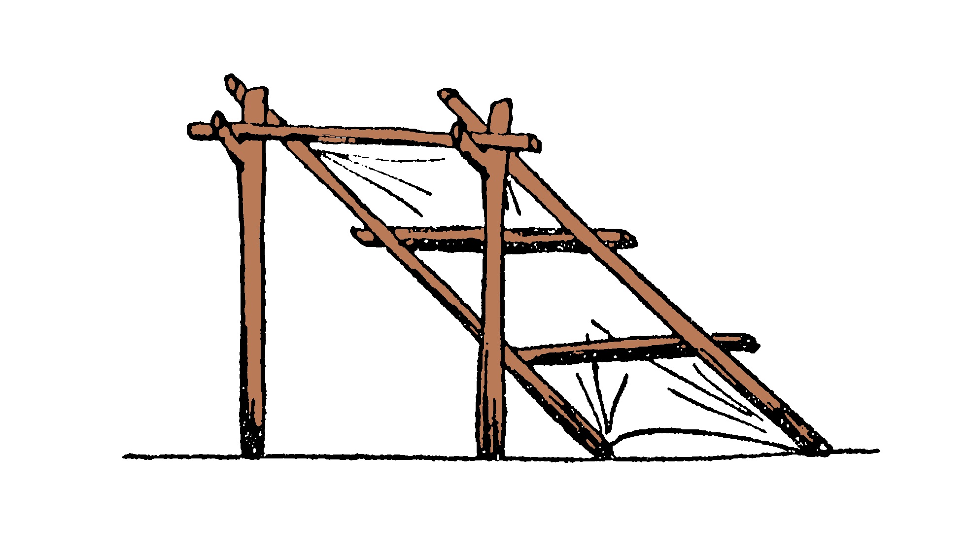 Много весит и занимает места - палатка, спальник и коврик, если их заменить на полиэтилен + подготовка места под ночевку (сбор подстилки и т.д.) + правильный подбор одежды + нож.