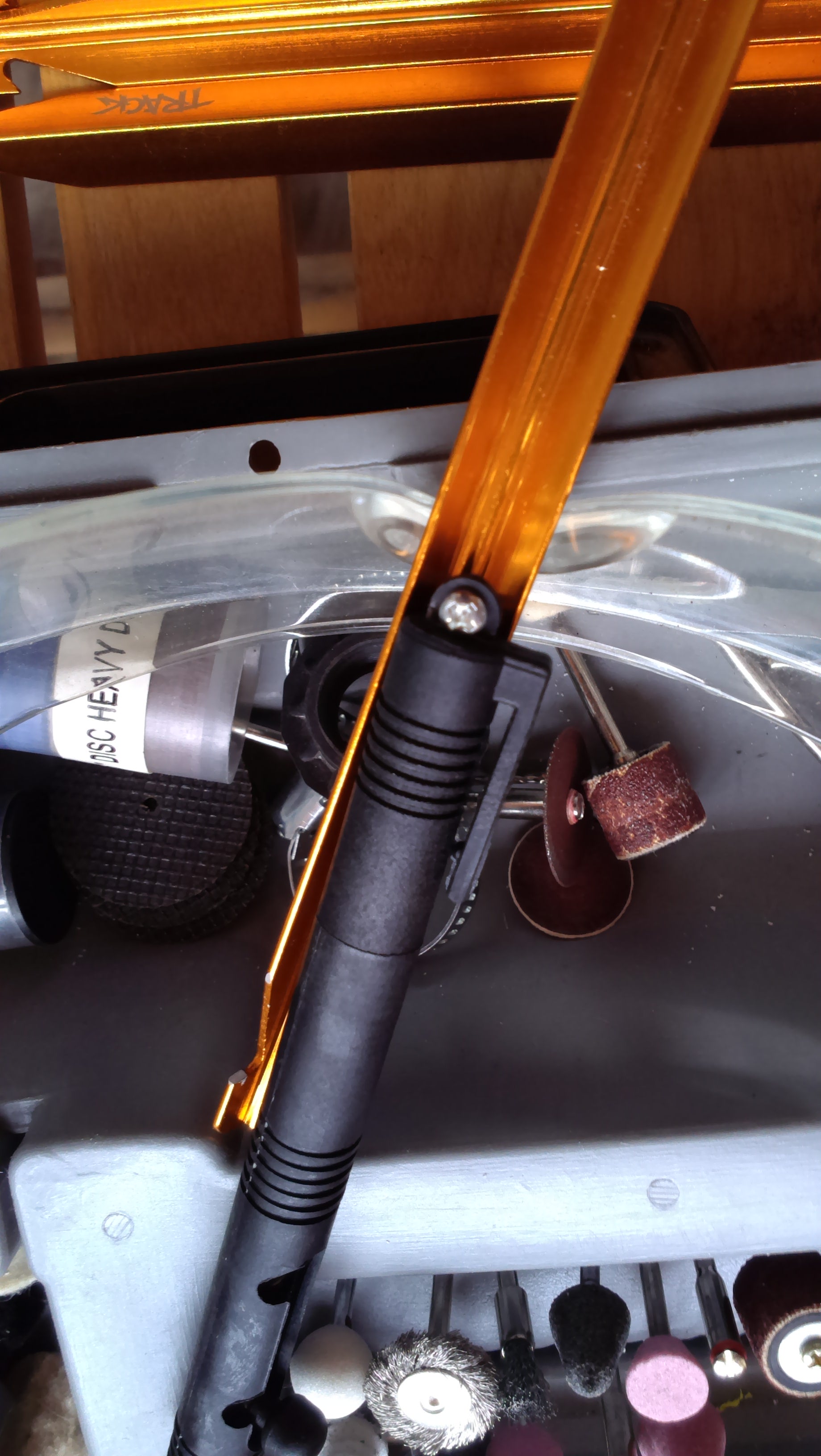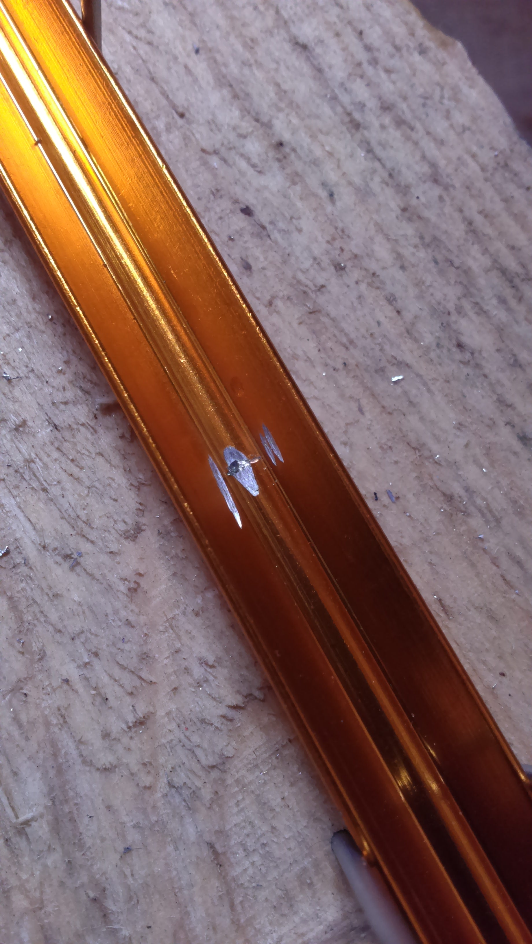 Дремелью, или зубами, делаем на полукруглой части плоскую площадку - так будет проще сверлить.