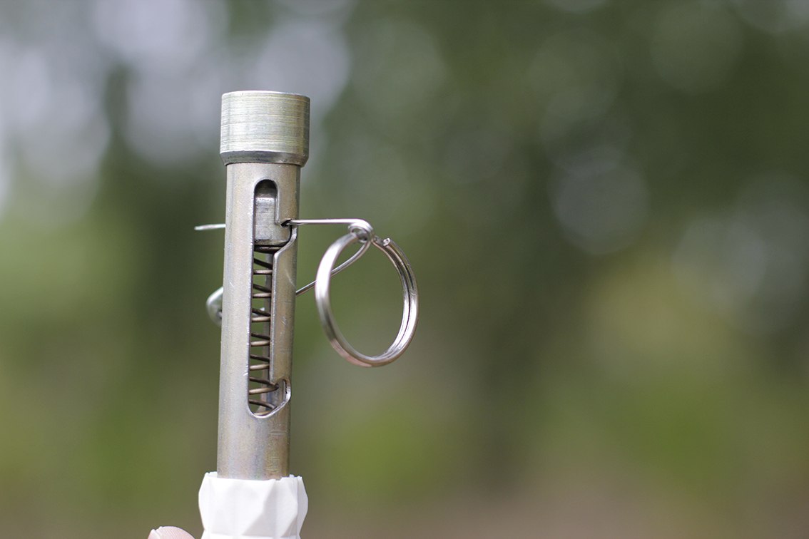 Покупаем в магазине колышек для палатки стоит у нас 22рубля выпрямляем соответствующим образом (см. фотографии) и сверлим в нем отверстие диаметром 10.5-11мм. Сталь колышка мягкая и легко поддается обработке. Теперь выкручиваем «курок» диаметр его резьбы М3 берем винт по длиннее я винты купил на рынке, чем больше длинна винта, тем больше рычаг и меньше нужно прилагать усилие, приложенное к проволоке (леске веревке). Для того, что бы винт не прошел на сквозь и его резьба не резала поверхность самой ракетницы на него надел кусочек трубочки отрезанной от гелевой авторучки см. фото.