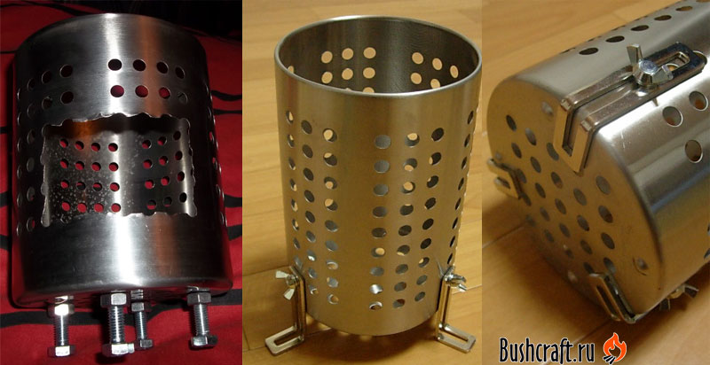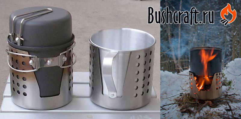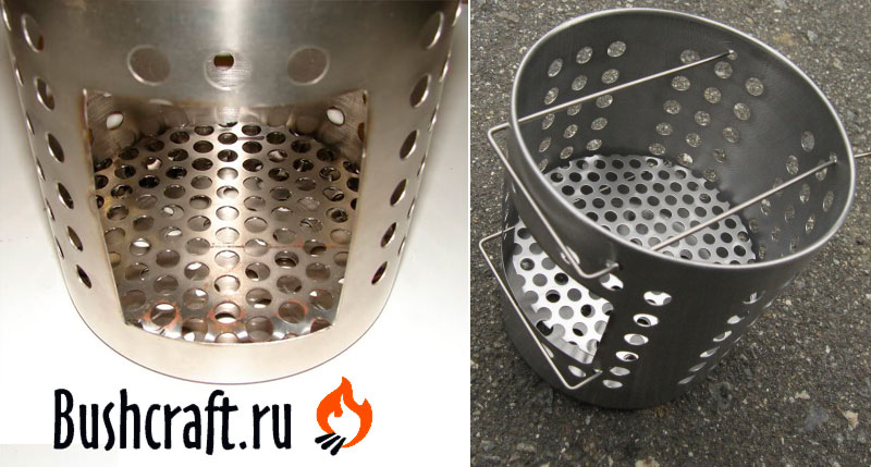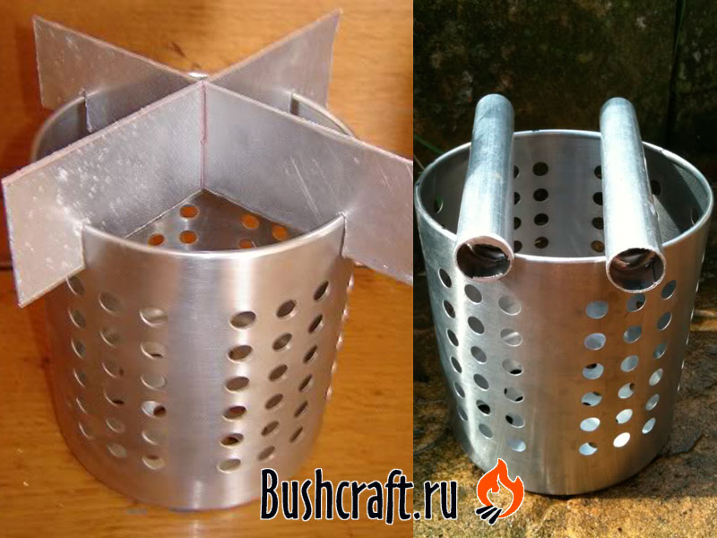 Для установки маленьких котелков и кружек внутрь - приспосабливать проволочные перегородки и стальные колышки для палаток (алюминий расплавится).